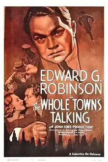 The Whole Town's Talking (released in the UK as Passport to Fame) is a 1935 American comedy film starring Edward G. Robinson as a law-abiding man who bears a striking resemblance to a killer, with Jean Arthur as his love interest. It was directed by John Ford from a screenplay by Jo Swerling and Robert Riskin based on a story by W.R. Burnett originally published in Collier's in August 1932.[1] Burnett was also the author of the source material for Robinson's screen break-through, Little Caesar.[2] The film The Whole Town's Talking (1926) has no story connection to this film.