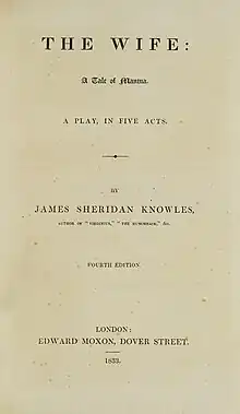 The Wife: A Tale of Mantua (also known as The Wife of Mantua is an 1833 historical play by the Irish writer James Sheridan Knowles.[1] It premiered at the Theatre Royal, Covent Garden in London on 24 April 1833.[2] The cast included Sheridan Knowles as Julian St. Pierre, Ellen Kean as Mariana, Charles Kean as Leonardo, James Prescott Warde as Ferrardo, George Bennett as Antonio, William Abbot as Lorenzo, Edwin Ransford as Hugo, Drinkwater Meadows as Bartolo and William Payne as Pietro. The epilogue was written by Charles Lamb.[3] It is set in Mantua during the reign of the House of Gonzaga.