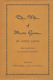 The Wife of Martin Guerre (first published 1941) is a short novel by American writer Janet Lewis based on the story of Martin Guerre, the 16th-century French peasant who apparently returned home to his wife after a long absence but was later revealed to be an impostor. The novel has its origins in research Lewis made into trials based on circumstantial evidence, after reading in-depth about famous trials turning on circumstantial evidence, which prompted her to write a pamphlet describing the risks of using it.[1]