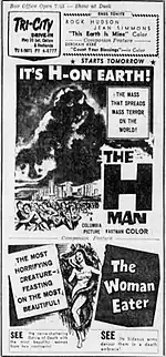The Woman Eater was released in the UK in April 1958 as Womaneater on an 'unashamedly exploitative double bill with Blonde in Bondage', a Swedish crime drama from 1957.[8] It was double-billed in the US in July 1959 with The H-Man, a 1958 Japanese science fiction film.[9] In the UK, The Woman Eater was given an X-certificate from the British Board of Film Censors (BBFC), which meant it could not be exhibited to people age 16 or younger.[10][11] However, the film appears to have been promoted as a children's movie in the US. BoxOffice magazine recommended to exhibitors that they target the film to 'the kiddie matinee in larger houses or the smaller neighbourhoods and drive-ins that draw a large percentage of children'.[12]