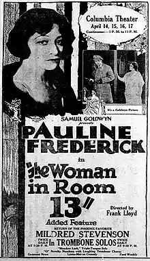 The Woman in Room 13 is a lost[1] 1920 American silent mystery drama film directed by Frank Lloyd and starring Pauline Frederick.[2] It was produced and distributed by Goldwyn Pictures and is based on a Broadway play of the same name, The Woman in Room 13.[3] The film was remade at Fox in 1932 as a talkie.
