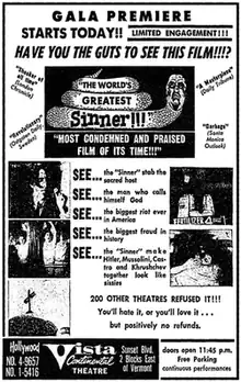 The World's Greatest Sinner debuted at the Vista Continental Theater in East Hollywood on January 30, 1963. Director Martin Scorsese is one of the film's supporters, having named it as one of his favorite rock and roll films. Musician Will Oldham has also championed the film, and selected it when invited to present a favorite film at the 2001 Maryland Film Festival.