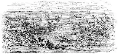Pictures of the fable in books for some centuries usually depicted a group of men pointing opposite ways by the stream-side, following the emblematic lead of the German illustrator of Fearno's Centum Fabulae (1590)[11] and of François Chauveau, the original illustrator of La Fontaine's Fables.[12] It was only much later that attention switched to a compassionate view of the drowned woman, as in Gustave Doré's illustration of the fable (above) and Marc Chagall's 1952 etching.[13] These follow in the wake of sympathetic treatments of the subject like the "Ophelia" (1852) of John Everett Millais[14] and "A Christian martyr drowned in the Tiber during the reign of Diocletian" (1855) by Eugène Delacroix.[15]