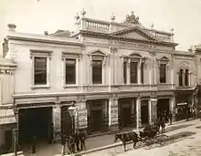In December 1865 a prospectus was issued in Adelaide for a Theatre Royal company to take over White's Assembly Rooms and the adjacent Clarence Hotel,[2] alternatively to purchase a vacant site and erect a new building.[3] By December 1867 plans had been prepared for a new structure to be added to the rear of Peter Cummings & Son's drapery store at 21 Hindley Street, Leonard Voullaire's at 23 (then was the financially troubled Paull & Meredith's wine bar 1868–1870), and Mrs Bament's at 27.[4] Paull & Meredith had a wine bar.[5] Thomas English was chosen as supervising architect and W. Lines the builder.[6] The proprietors were Lazar, John Temple Sagar, and Jochim Matthias Wendt.[7] The foundation stone was laid by owner of the property Henry Fuller on 8 January 1868, and the At the foundation ceremony, Fuller, then Mayor of Adelaide, said that it would replace the "inferior" Royal Victoria as Adelaide's principal theatre. Seating 1300, it opened as Adelaide's second major theatre.[8]