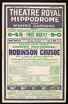 In 1820, Henry Harris bought a site in Hawkins Street and built the 2,000-seater Albany New Theatre on it at a cost of £50,000, designed by architect Samuel Beazley.[9] This theatre opened in January of the following year. In August, George IV attended a performance at the Albany and, as a consequence, a patent was granted. The name of the theatre was changed to the "Theatre Royal" to reflect its status as a patent theatre. The building work was not completed at the time of opening and early audience figures were so low that a number of side seating boxes were boarded up. On 14 December 1822, the "Bottle Riot" occurred during a performance of She Stoops to Conquer attended by the Lord Lieutenant, Marquess Wellesley: Orangemen angered by Wellesley's conciliation of Catholics jeered him during the national anthem, and a riot ensued after a bottle was thrown at him. Wellesley's overreaction, including charging three rioters with attempted murder, undermined his own credibility.[10][11]