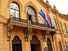 The Croatian National Theatre in Osijek was designed by Karl Krausner and built in 1866 in a in historic style with elements of Moorish architecture. The building originally also housed a casino and ballroom on the first floor. With the establishment of a professional theatrical ensemble in 1907, there were plans for a new building to accommodate their needs. This never happened, and despite several attempts at reconstruction, it was only in 1945 when the casino and a wing of the neighbouring hotel became available that the existing venue was able to support their needs.[1] Following severe damage in the homeland war of 1992–1994, the building was again completely reconstructed. Today, the horse-shoe shaped auditorium contains a parterre and three tiers of boxes and provides seating for 420 patrons.