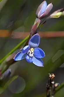 Thelymitra aemula, commonly called the gumland sun orchid,[2] is a species of orchid in the family Orchidaceae that is endemic to New Zealand. It has a single erect, dark green leaf with a reddish base and up to twenty or more pale mauve to dark sky blue flowers. It is similar to T. ixioides but has a differently coloured lobe on top of the anther.