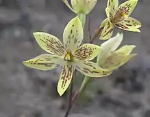 Thelymitra cucullata, commonly called the swamp sun orchid,[2] is a species of orchid that is endemic to the south-west of Western Australia. It has a single narrow leaf and up to ten small, greenish cream-coloured to white flowers with purple blotches and which quickly droop after they have been fertilised.