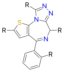 A thienotriazolodiazepine[1] is a heterocyclic compound containing a diazepine ring fused to thiophene and triazole rings. Thienotriazolodiazepine forms the central core of several pharmaceutical drugs including: