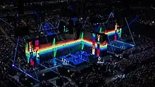 The 360° stage during North American and European arena concerts featured a cross-shaped screen, and several visual effects.