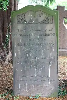 He is buried in the Dean Cemetery, Edinburgh with his wife Amelie Robertson (1869-1942), whom he had married in 1890, and their daughter Mildred Bruce Tupman (d.1972). The grave lies to the north of the southern path, near to that of Henry Snell Gamley.