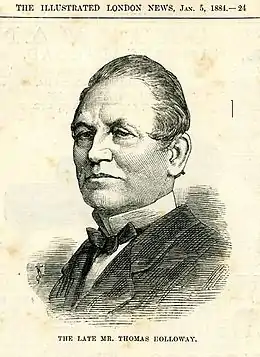 Holloway was born in Devonport, Plymouth, Devon, the eldest son of Thomas and Mary Holloway (née Chellew), who at the time of their son's birth had a bakery business. They later moved to Penzance, Cornwall, where they ran The Turk's Head Inn.[1] In the late 1820s, Holloway went to live in Roubaix, France, for a few years. He returned to England in 1831 and worked in London as a secretary and interpreter for a firm of importers and exporters. In 1836, he set himself up as a foreign and commercial agent in London.
