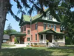 Thompson-Ray House is a historic home located at Gas City, Grant County, Indiana. It was built between 1902 and 1906, and is a 2+12-story, Late Victorian Free Classic style brick and stone dwelling. It has a cruciform plan and gable roof. It features porches with multiple classical columns and a porte cochere.[2]:5