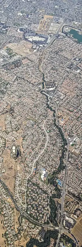The Thompson Creek watershed currently drains an area of approximately 18 square miles (47 km2)[6] with its source on the southern flank of Mount Misery in the western foothills of the Diablo Range southeast of San Jose, California. Upper Silver Creek and Thompson Creek both historically sank into the alluvial basin of Evergreen Valley in southeast San Jose.[7] Then they resurfaced and flowed into a large freshwater marsh known historically as Laguna Socayre, and referred to more recently as Silver Creek Marsh.[8] In the 1970s, Upper Silver Creek flows were shunted due west into a flood control channel discharging directly to Coyote Creek south of Singleton Road, although a remnant of Silver Creek flows into Thompson Creek (after the latter was extended to Silver Creek Marsh in 1970).[6][7] In 1978, Silver Creek Marsh was excavated into a flood water detention pond or reservoir, now known as Lake Cunningham.[7] Thompson Creek was routed around the west side of Lake Cunningham to the north side where it joins with Flint Creek to form the source of today's Lower Silver Creek, as indicated by the Santa Clara Valley Water District (now Valley Water).