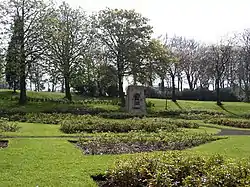 The park also contains a memorial, erected shortly after it opened, commemorating Dr James Mackenzie, a pioneering Scottish cardiologist who spent over 25 years as a general practitioner in the town. The memorial consists of a bronze bust by L. F. Roslyn set in a pink granite niche in a sandstone wall with stepped sides and top. The niche is round-headed with a bronze garland around the top, and with the life-sized bust standing on an inscribed pedestal.[10]