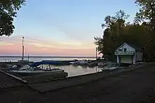 Thorah Island is a lake island located in the southeast portion of Lake Simcoe, approximately 4 kilometres (2.5 mi) west from Beaverton in Ontario, Canada. The island, part of Brock Township, is approximately 1,450 acres (6 km²) in size and the land is divided mainly between wooded and wooded-swamp terrain. Some land has been cleared for farming and recreational purposes but much of the agricultural land has fallen into disuse and has grown over. Centre Road runs from the east side of the island to the west side but is not much more than a dirt path. A small harbour exists on the east side of the island, directly across from Beaverton Harbour. There are several sandy beaches on the west side of the island, but most of the island's shore is rocky.