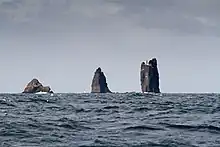 Þrídrangaviti Lighthouse (transliterated as Thridrangaviti) is an active lighthouse 7.2 kilometres (4.5 miles) off the southwest coast of Iceland, in the archipelago of Vestmannaeyjar. It is often described as one of the most isolated lighthouses in the world.[1][2] Þrídrangar means "three rock pillars", referring to the three named sea stacks at that location: Stóridrangur (on which the lighthouse stands), Þúfudrangur, and Klofadrangur.[3] The lighthouse was commissioned on July 5, 1942.[4]