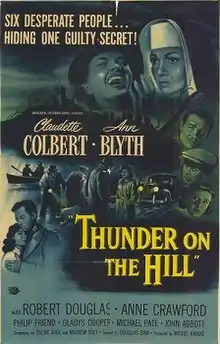 Thunder on the Hill is a 1951 American film noir crime film directed by Douglas Sirk and starring Claudette Colbert and Ann Blyth. The picture was made by Universal-International Pictures and produced by Michael Kraike from a screenplay by Oscar Saul and Andrew Solt, based on the play Bonaventure by Charlotte Hastings. The music score was by Hans J. Salter and the cinematography by William H. Daniels.