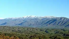 Thunderhead Mountain is a 5,527-foot (1,685 m) mountain in the west-central part of the Great Smoky Mountains, located in the southeastern United States. Rising along the border between Tennessee and North Carolina, the mountain dominates the western Smokies. The Appalachian Trail crosses its summit, making it a popular hiking destination. Rocky Top, a knob on the western part of the mountain's summit ridge, shares its name with a popular Tennessee state song.