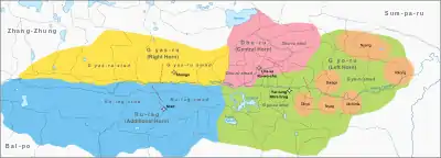 - ↑ Beckwith, Christopher I. The Tibetan Empire in Central Asia. (1987), pp. 34–-36. Princeton University Press. ISBN 0-691-02469-3.