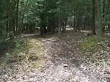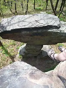 Ticklish Rock is an unusual sandstone rock formation, located in Shrewsbury Township, Sullivan County, Pennsylvania. The brown and green sandstone formation, which stands at the edge of a steep cliff and resembles an upright hammer. It consists of a large horizontal block, 3 feet high, 8 feet long, and 6 feet wide (0.9 x 2.4 x 1.8 m), balanced upon a thin, 18 in × 30 in (46 cm × 76 cm) pedestal.