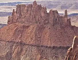 Tiki Tower is a thin 300-foot (91-meter) tall sandstone pinnacle located in the Airport Tower/Monster Tower/Washer Woman area of the Island in the Sky District of Canyonlands National Park, in San Juan County, Utah.[2] It is situated one-half mile northwest of Airport Tower, and is composed of Wingate Sandstone, which is the remains of wind-borne sand dunes deposited approximately 200 million years ago in the Late Triassic. Access to this tower is via the four-wheel-drive White Rim Road. The top of this spire rises 1,100 feet above the road in a little more than one mile. Precipitation runoff from Tiki Tower drains southeast into the nearby Colorado River via Buck and Lathrop Canyons. The first ascent of Tiki Tower was made in November 1991 by Jeff Widen and Mitch Allen, via Brave Little Toaster (5.11, 3 pitches), with Fred Lifton and Paul Frank working the first pitch.[3][4]