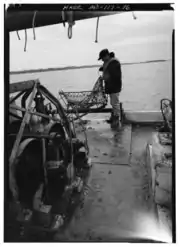 When the Chesapeake Bay area was first settled in the 1600s, it was a bountiful source of fish and other seafood. The area around Tilghman Island had particularly rich oyster beds. Watermen earned their livelihood from a variety of tasks: crabbing, oystering, tonging and dredging, seafood packing and canning, and guiding hunting parties. The maritime industry of shipbuilding became established on the island, and several types of boats developed for use in local conditions.[3] Log canoes with sails, adapted from the canoes of Powhatan tribes, are local to the area.[4] So are skipjacks, two-masted sailboats used for oystering on Chesapeake Bay. Skipjacks have remained the primary boat for oystering due to a Maryland law banning the use of motors for oystering.[5]