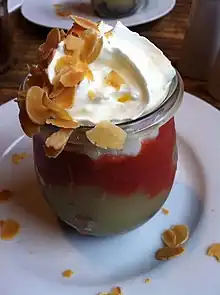 Example of a recipe: Applesauce (or other mashed fruits) are spread out at the bottom, followed by a layer of whipped cream, a layer of toasted bread- or rusk crumbs, followed by another layer of whipped cream and usually a thin layer of crumbs on top. Often in multiple layers. Possible decorations also include hazelnuts or flaked almonds.[3]