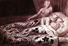 Tiriel is a narrative poem by William Blake, written c.1789. Considered the first of his prophetic books, it is also the first poem in which Blake used free septenaries, which he would go on to use in much of his later verse. Tiriel was unpublished during Blake's lifetime and remained so until 1874, when it appeared in William Michael Rossetti's Poetical Works of William Blake.[1] Although Blake did not engrave the poem, he did make twelve sepia drawings to accompany the rough and unfinished manuscript, although three of them are considered lost as they have not been traced since 1863.[2]