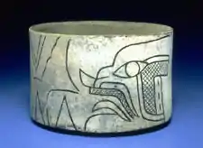 Tlapacoya was also a manufacturing center for so-called "Dragon Pots" (see photo below).[1] These flat-bottomed cylindrical bowls have white or buff surfaces incised with almost abstract Olmec-style drawings, generally of were-jaguars.