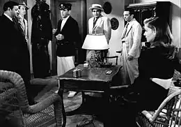 According to English film critic Robin Wood, To Have and Have Not presents "one of the most basic anti-fascist statements the cinema has given us."[69] The film portrays anti-fascist themes common to the time period through its emphasis on individual liberty expressed through Bogart's character and through its representation of people progressing and working together well.[70] When he decides to join the resistance cause, Morgan reasons, "maybe because I like you and maybe because I don't like them." The power of this anti-fascist statement comes because it's instinctive rather than coming from an expected ideology.[71] More generally, Hawks expresses a protest of authoritarianism and infringement of individual rights. Hawks, however, claimed he wasn't interested in politics and the focus of the movie was on the relationship between Bogart and Bacall. Regardless, the anti-fascist themes come through in the relationship between Bogart and Bacall. They represent the individual standing up to those who abuse their power.[72] According to Ian Brookes, during the scene where Bacall sings "Am I Blue?" with Hoagy Carmichael, her low-voice establishes herself as "one of the boys" and thus a "soldier" in the anti-fascist cause.[73] Moreover, during this scene, the patrons at the bar represent different races and are racially integrated throughout the space, challenging the ideas of segregation and race during the time period.[74] The next song, Hong Kong Blues is reminiscent of Django Reinhardt's pre-war version. This represents French resistance spirit as swing music became a symbol of resistance in France, because it was the only available example of American culture in France at the time.[75]