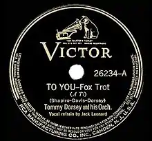 Tommy Dorsey and his Orchestra released the song as an A side RCA Victor 78 single in 1939, 26234-A. According to the tsort.info database, "To You" reached no. 10 on the Billboard chart, staying on the chart for 7 weeks.[3]