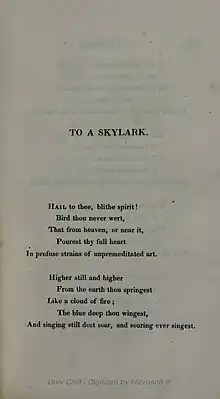 "To a Skylark" is a poem completed by Percy Bysshe Shelley in late June 1820 and published accompanying his lyrical drama Prometheus Unbound by Charles and James Ollier in London.[1]