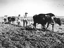 Members of the Qom community in the early 1960s use an ox to plow the fields of their farm.