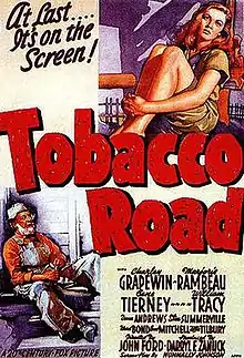 Tobacco Road is a 1941 American comedy-drama film directed by John Ford and starring Charley Grapewin, Marjorie Rambeau, Gene Tierney and William Tracy. It was based on the 1932 novel of the same name by Erskine Caldwell and the 1933 Broadway play that Jack Kirkland adapted from the novel.[1] The plot was rewritten for the film by Nunnally Johnson, who had worked with Ford on The Grapes of Wrath the previous year; the plot was altered to fit Production Code demands for a lighter tone while retaining plot elements.[2]