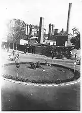 Stellings's former administration building and a former factory building are located on the east side of the southern portion of the square (Valgaardsvej). The adjacent Nordisk Kulsyrefabrik (Nordic Carbonic Acid Factory) with its condensator tower is from 1896.[3] The buildings now house Valby Cultural Centre (Valby Kulturhus).