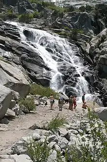 Tokopah Falls, also known as Tokopah Valley Falls, is a 1,200-foot (370 m) cascading waterfall in Sequoia National Park, California. The falls are formed as the Marble Fork of the Kaweah River slides down a huge granite headwall of the glacial Tokopah Valley. Although the falls flow powerfully during the snow melt of late spring and early summer, it is usually a trickle by autumn, occasionally drying up completely during poor snow years.