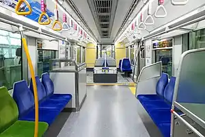 Passenger accommodation consists of a mixture of facing 4-seat bays and longitudinal bench seating, and includes luggage racks next to the doorways.[3] The seats are covered in a blue moquette incorporating the traditional Japanese seigaiha (青海波) pattern.[3] LED lighting is used throughout.[3] Passenger information is provided by 7-inch wide LCD displays above the doorways.[3] Information is provided in four languages: Japanese, English, Chinese, and Korean. Initially one screen is provided above each doorway, but provision is made for installing a second screen in the future.[3]