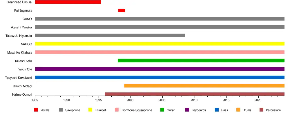 The band's first release was 1989's eponymous six-track EP, released on vinyl by local independent label Kokusai Records.[13] That record's acceptance, coupled with the band's live shows, got them a deal with Epic Records. At this time the 'classic' lineup of the band included: Asa-Chang (percussions), Tsuyoshi Kawakami (Bass), Tatsuyuki Aoki (drums), Yuichi Oki (keyboards), Marc Hayashi (guitar), Tatsuyuki Hiyamuta (alto sax/agitate man), Gamo (tenor sax), Atsushi Yanaka (baritone sax), Nargo (trumpet), Masahiko Kitahara (trombone) and Cleanhead Gimura (vocals). Yuhei Takeuchi (alto sax) was part of the original lineup, but left in 1990, though he has re-joined the band live on several occasions.