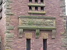 The building has variegated exterior walls of yellow, amber, and brown brick, with rough-cut and mottled red, yellow and brown sandstone lintels and quoins.[4][5][11] The main structure has a hip roof pierced at the center by a low chimney.[7] The building's roofs were originally all of red tile, lost in a 1975 fire;[4] tile remains on the tower and entry porch.[10] The building's entranceway has large front doors below a one-story columned, hipped-roof entrance porch.[2] A stone plaque above the porch bears the emblem of the railroad: "Ohio Central".[4] Above this is a vertical openwork brick pattern, reinforcing the structure's Japanese-influenced design.[2]