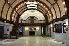 The interior spaces are intricate and largely intact.[4] The building's porch leads into a vestibule, and from there into the former passenger waiting room, which resembles Union Station in St. Louis, Missouri, built in 1894.[5] The 30-by-60-foot (9.1 m × 18.3 m) room,[11] making up most of the interior, has mahogany woodwork and an Italian marble floor. The ceiling is barrel-vaulted with wooden ribs and pressed sheet metal panels. Elaborate plaster bas-reliefs of cherubs are situated at each end of the room. The original ticket office and ticket window are at the west side of the room.[4] The south end of the room features a large log fireplace with black andirons and a black iron hood, beneath a broad balcony. The room was originally furnished with long wooden benches and potted plants.[11] A brass plaque in the room shows the high water mark from the Great Flood of 1913.[15]