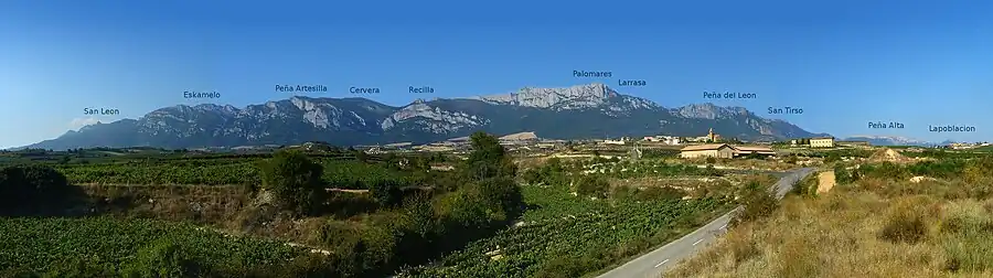 From the west, the range rises from the Conchas de Haro where the River Ebro enters the region of La Rioja at 445 metres above sea level, and from there runs east forming the northern border of the Rioja Alavesa, separating the Rioja region from the rest of Álava. Its highest point is Mount Toloño at 1271 metres above sea level in the municipality of Labastida.