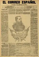 Since the mid-1880s Carlism was increasing paralyzed by a conflict between the claimant Carlos VII and the chief theorist of the movement, the charismatic Ramón Nocedal; apart from personal rivalry, it was conditioned by different visions of political priorities and the strategy to be adopted. In 1888 the strife climaxed in open rebellion of the so-called Nocedalistas, soon to be known as Integrists. Within the Madrid organization Domínguez sided with Cerralbo against Nocedal and opted for loyalty to his king.[46] As the breakaways controlled two key Traditionalist newspapers, La Fé and El Siglo Futuro, the loyalists remained with no Madrid-based daily which could serve as the semi-official national party mouthpiece. Domínguez Romera and Cerralbo labored to create an alternative press platform; their works were crowned with success in 1889, when the new Carlist daily El Correo Español was launched.[47]