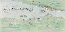 From Margarita the company sailed to Vera Cruz, arriving there some time during 1614; while plans were being made for operations in the Gulf of California, Basilio died. Nicolás de Cardona was appointed captain to replace him, with Juan de Iturbe and Pedro Alvarez de Rosales being given joint command with him. The same year, the company crossed New Spain by land and made their headquarters at Acapulco, where construction of three ships began immediately. By January 1615, three frigates, San Francisco, San Antonio, and San Diego were built and equipped for the voyage to California, at a cost of more than 45,000 pesos.[1] Iturbe's company of men included a number of soldiers from Mexico City. Before he could set out, reports reached Acapulco that Dutch corsairs had entered the South Sea through the Straits of Magellan and were headed for New Spain after raiding the coast of Peru. The alcalde mayor ordered Iturbe to delay his departure, and impressed his company into service to ready the port for defending it against the corsairs, a task that took more than two months. Although engaged in a service for the Crown, Iturbe was forced to pay his men out of company funds during this period. The work was finished at the end of March and the three ships set sail for California with Iturbe in command.[1]