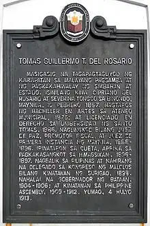 Tomás Guillermo T. del Rosario (February 10, 1857 July 4, 1913) was a Filipino judge and statesman who served as the first Governor of the province of Bataan from 1903 to 1905. He is remembered for advocating the separation of church and state.[1]