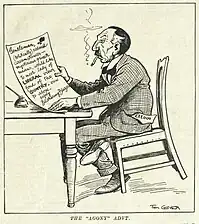 The political demise of Billy Hughes and the ascendancy of Stanley Bruce was represented as a tragedy for Australian cartoonists, as depicted in Glover's cartoon in The Bulletin of 8 February 1923.[20] Hughes' physical characteristics had been considered to be "God's gift to cartoonists". When Bruce became Prime Minister, according to a satirical article in Sydney's Daily Pictorial, "all over Australia the cartoonists sat dumbly biting their pencils, trying to figure out what they could do with the regular polished countenance of Stanley Melbourne Bruce". It was Glover that "leapt, pencil in hand, into the breach". The Bulletin artist solved the problem by representing him as "a blase, supercilious, spatted figure [who] strutted with a grand air of dignified aloofness across the boards that [Hughes] had vacated".[21] In December 1926 it was reported that the Australian Prime Minister, Stanley Bruce, had a "very fine private collection" of Australian art, including a set the original artwork of cartoons of himself by Tom Glover.[22]