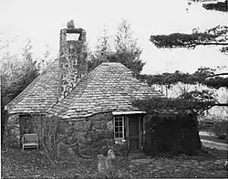 The Tom Thumb House is located south of the village center of Norfolk, on the south side of Windrow Road. It is set on a hillside above the road, from which it and an adjacent later house are screened by trees. It is a single-story structure, consisting of two roughly square sections joined at a corner. The walls of each section are made of large boulders, and are up to 2.5 feet (0.76 m) thick. The pyramidal roofs of each section, framed with hand-hewn timbers recycled from old barns, are covered in thick slate. One of the squares has the main living space, while the other houses a sleeping and kitchen area. Exposed framing and rough paneling, also recycled, are the principal exposed woodwork.[2]