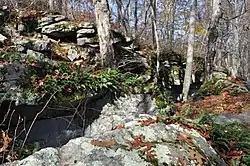 The Tomaquag Rock Shelters (RI-HP-1) are a prehistoric rock shelter site off Maxson Hill Road (formerly Burdickville Road) in Hopkinton, Rhode Island. The shelters are located under two east-facing granite outcrops in the valley drained by Tomaquag Brook. Nathan Kaye discovered the shelters in the late 1950s. Materials recovered from test excavations resulted in dating one shelter to 800 BC and the other to AD 800. Materials recovered include projectile points, stone knives, and evidence of stone tool construction. Both sites included evidence pointing to the presence of a fire pit.[2]