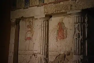 The interior of the structure is made up of two separate barrel-vaulted structures. The antechamber is unusually large: 6.5 m wide, 2.12 m long and 7.7 m high. This is because it is built to match the monumental scale of the facade.[1] The chamber seems to have been unpainted, but it was severely damaged in antiquity and has not been fully excavated.[2] The burial chamber is also barrel-vaulted, but is much smaller, measuring 4.8 m wide, 4.72 m long, and 5.26 m high.[1] The walls are covered in stucco. A white podium with a cornice runs around the base of the wall, supporting white stucco pilasters in low relief, which themselves support an architrave, topped by a cornice. The wall between the pilasters is painted red, and the faux architectural members are decorated with painted rosettes.[1] The design recalls wall painting in houses from the same period that have been excavated in Pella and Delos.[2] The grave goods included a wooden couch with ivory elements, most notably a small sculpture of a woman, which was found in the antechamber.[3]