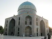 An 18-metre dome, covered in turquoise tiles, tops the mausoleum.[2][3][1] The tile work around the building is of matching colours.[2] Inside the mausoleum, the tomb of Al-Rabi ibn Khuthaym is located underneath the large dome.[1] There are also inscriptions written by calligraphers from the Safavid era, in the style of Thuluth and Bana'i, are present within the building.[3]